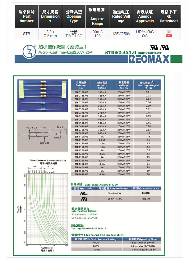 产品名称: 电阻式保险丝STB 3.0*7.2mm 环氧涂层(延时型)认证齐全