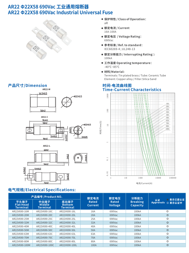 简述: 工业通用熔断器 AR22 22*58 690VAC INDUSTRIAL Universal Fuse