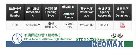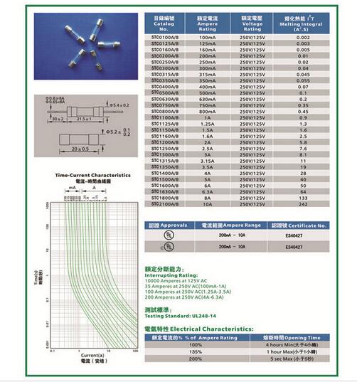产品名称: STC 5.2*20 玻璃慢断保险丝