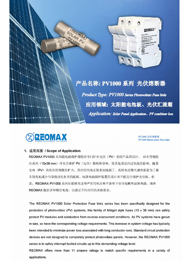 产品名称: 1000Vdc REOMAX光伏熔断器10X38mm PV1000