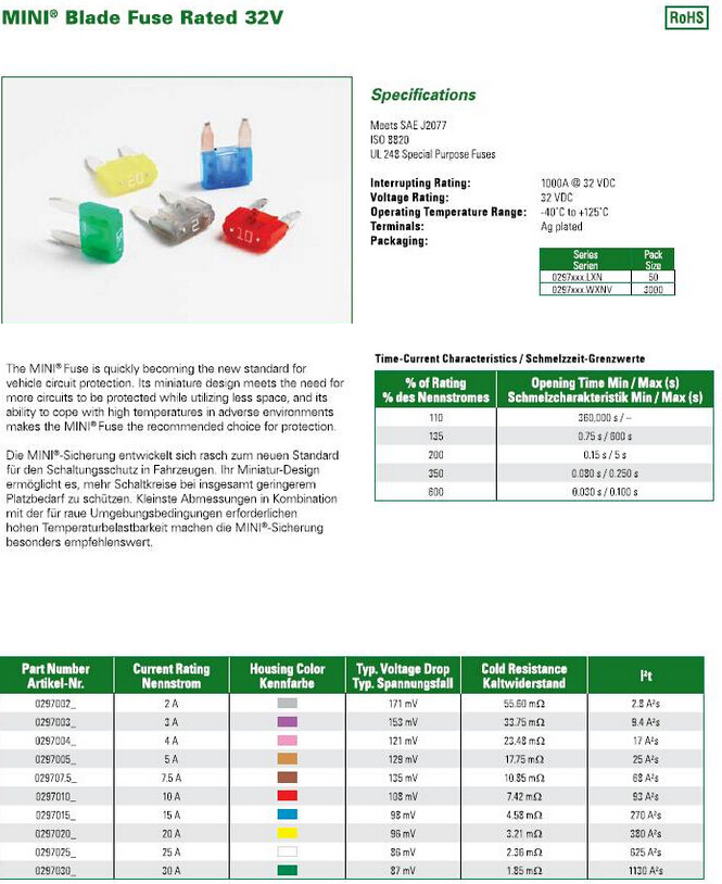 产品名称: 汽车保险丝Mini Blade Fuse认证齐全