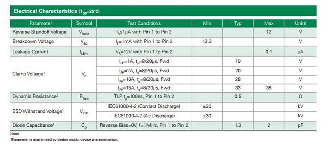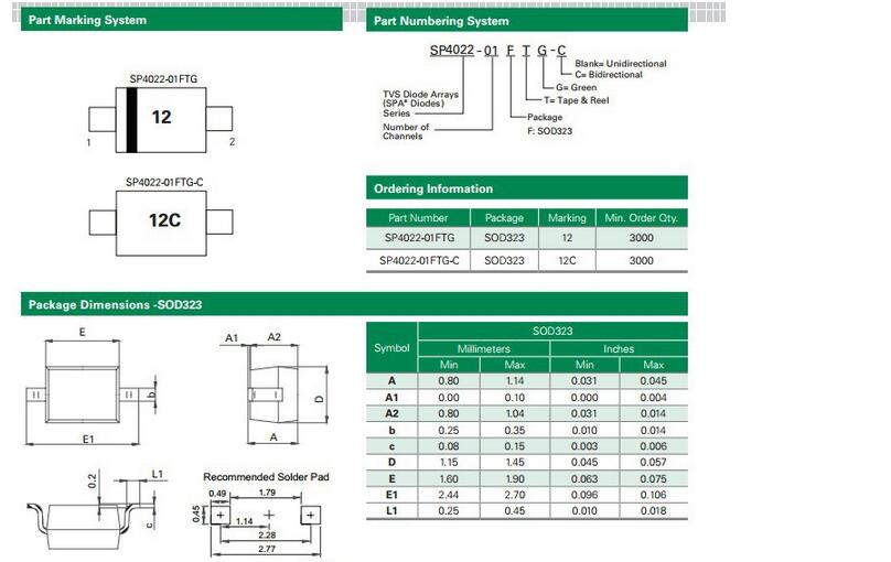 产品名称: SP4022 Series 1.3pF, 15A Discrete TVS Diode