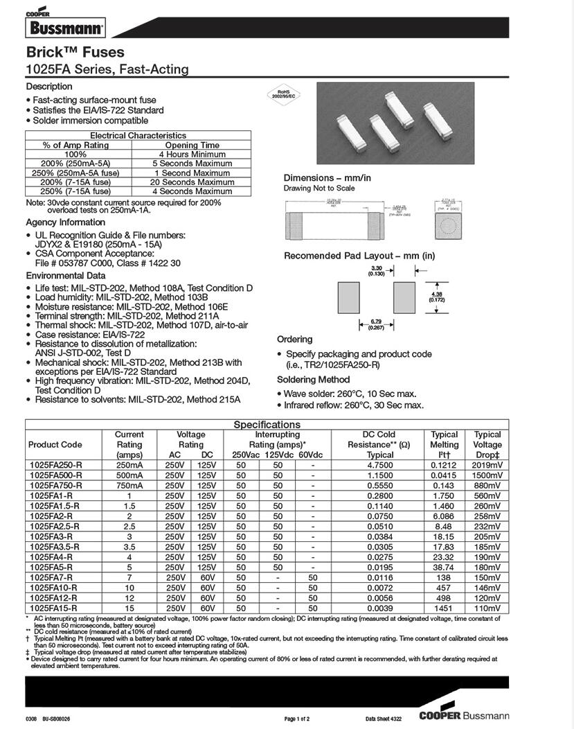 产品名称: BUSSMANN 1025FA贴片式保险丝 快断 250V