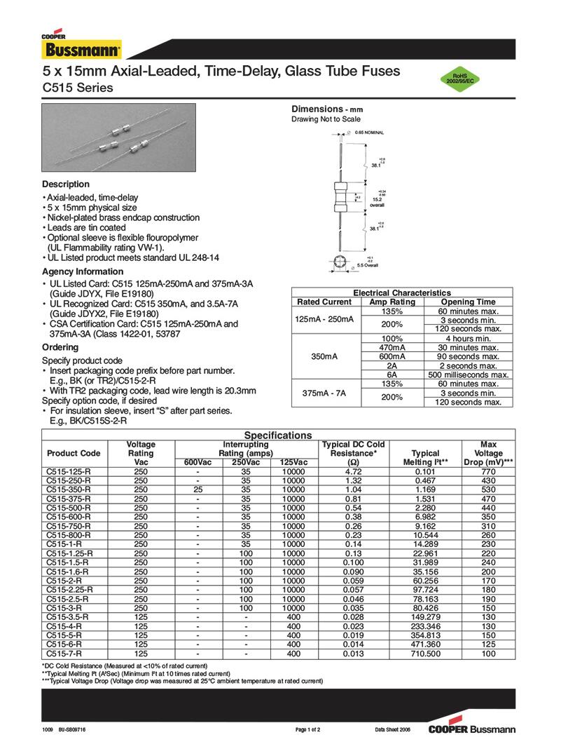 产品名称: bussmann C515 玻璃管保险丝 型号规格齐全