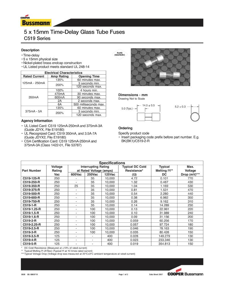 产品名称: 巴斯曼保险丝 C519 5*15MM 慢断保险丝