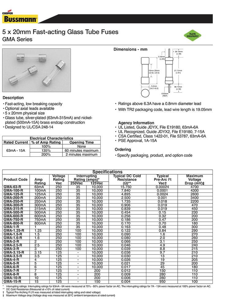 产品名称: BUSSMANN GMA 250V 玻璃管 快断保险丝