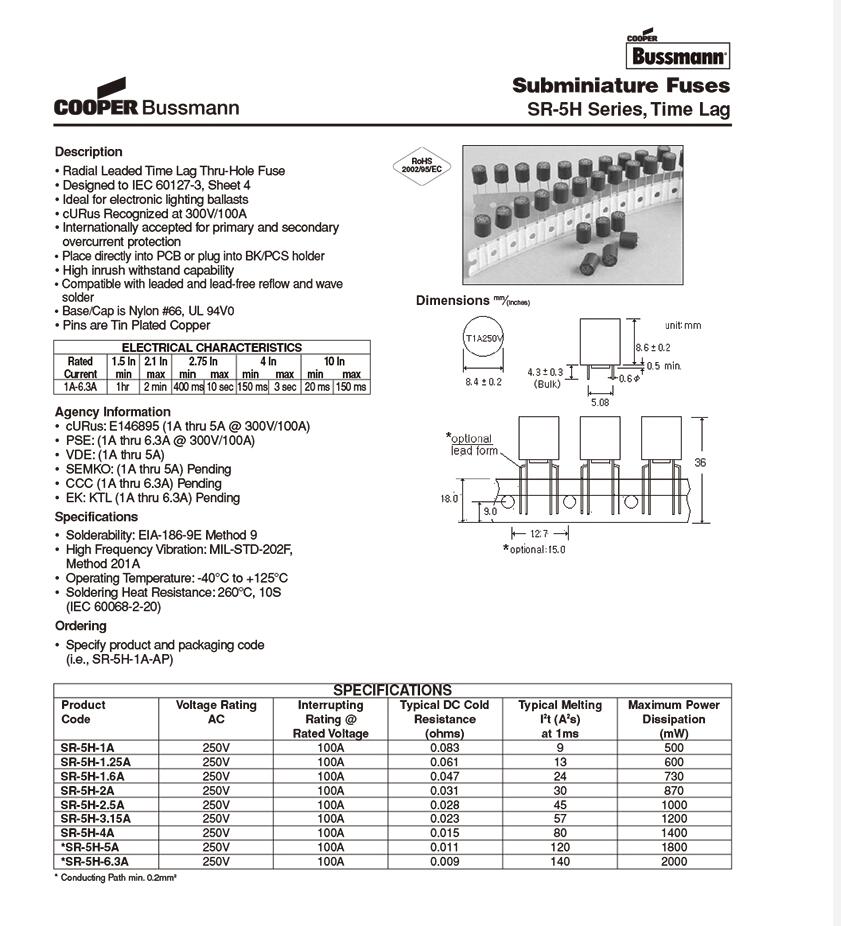 产品名称: SR-5H-1A-AP 250Vac 高分断 微型塑封保险丝