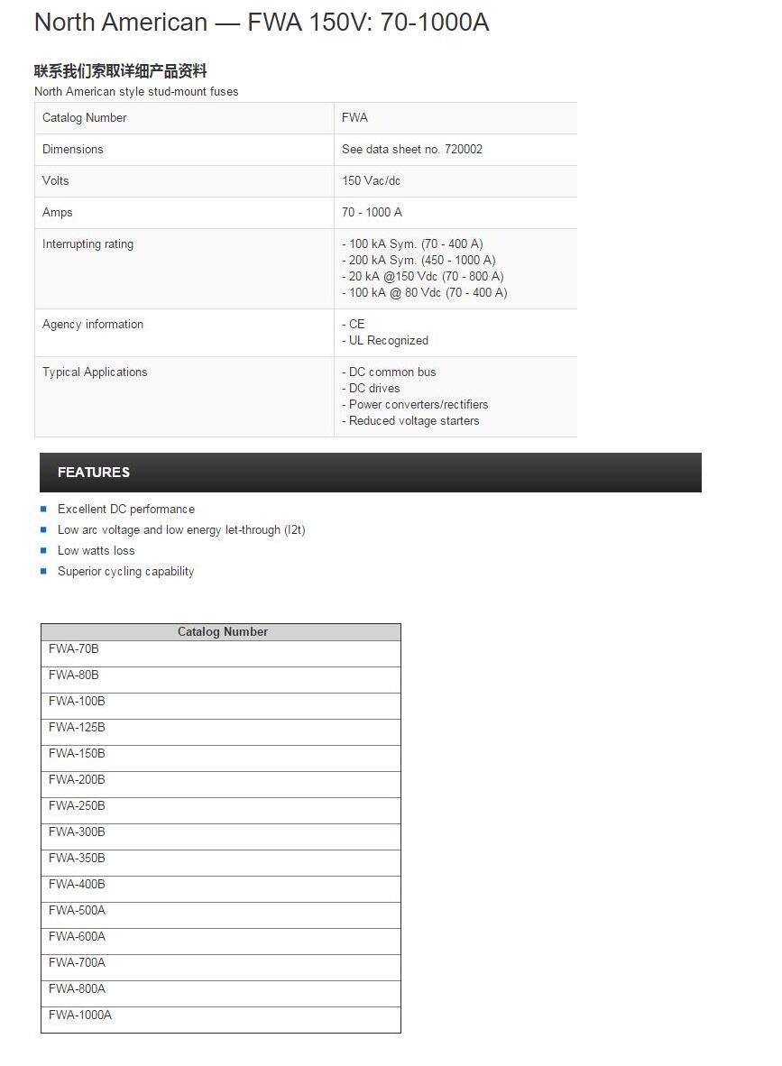 产品名称: 美标 FWA 150V: 70-1000A快速熔断器