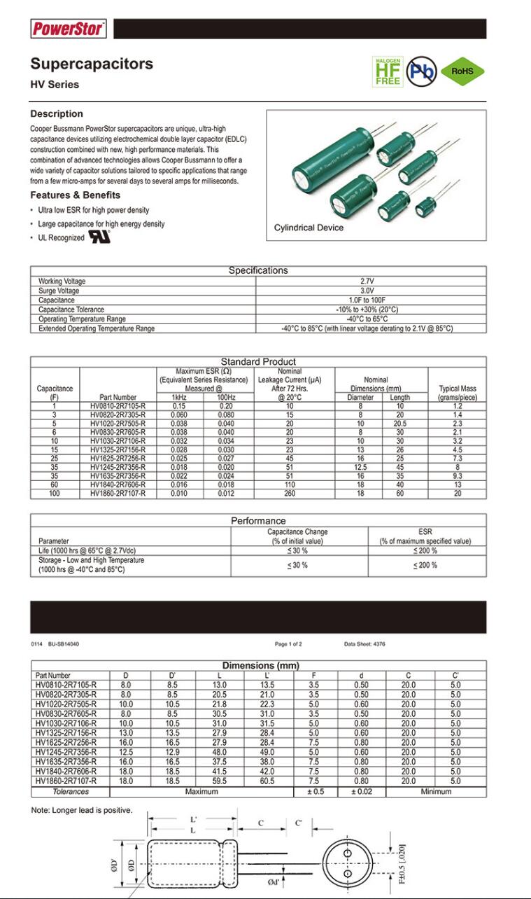 产品名称: HV1030-2R7106-R 高压超级电容器 圆柱绿色超级电容