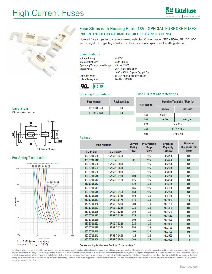 简述: Fuse Strips with Housing 48V 系列 - 48V带卡箍片状保险丝 - 特殊用途保险丝