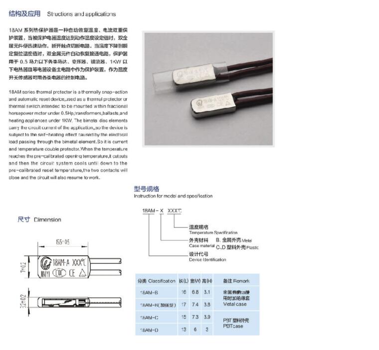 简述: 热保护器是两种不同合金的组合,在通过电流后会加热。 由于两种不同合金的热膨胀系数不同,合金将不可避免地在一个方向上弯曲,触点将离开,电流将被切断。 弯曲速度与通过电流成比例。 这可以保护电气设备。