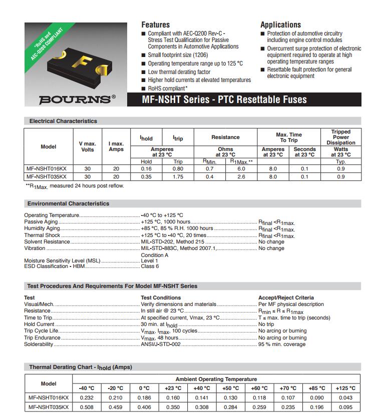 产品名称: BOURNS 车规保险丝 MF-NSHT AEC-Q200认证