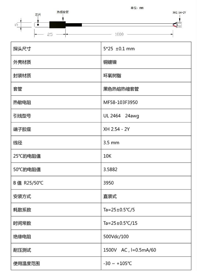 产品名称: NTC温度传感器 防水型密封温度探头 两芯护套线 XH2.54端子
