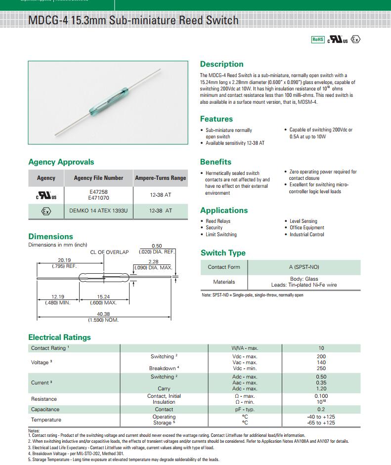 简述: MDCG-4 系列 - 15.3mm磁簧开关|HAMLIN|干簧管
