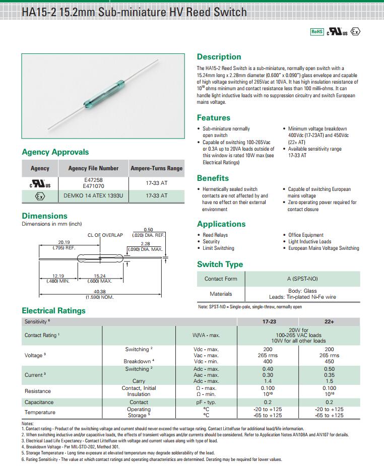 简述: HA15-2 系列 - 15.2mm高功率磁簧开关|HAMLIN|干簧管