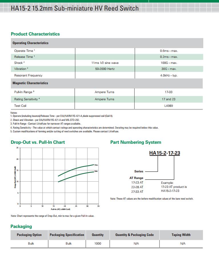 产品名称: HA15-2 系列 - 15.2mm高功率磁簧开关|HAMLIN|干簧管