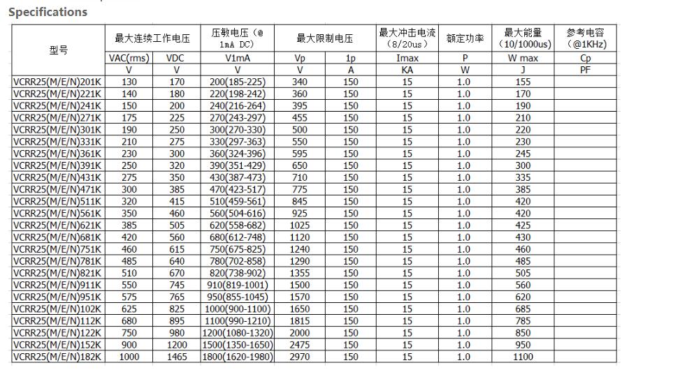 简述: TMOV25D系列(有方片和圆片) •压敏电压范围从(200V-1800V) •符合RoHS,Reach标准,无铅 •专利的集成热保护装置 - •旨在促进符合UL1449第3版SPD产品 •高峰值浪涌电流额定值高达10kA •波可焊 •标准引线形式和间距选项 •低泄漏 •-55°C至+ 85°C的工作温度范围
