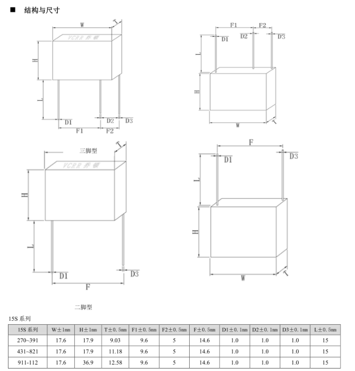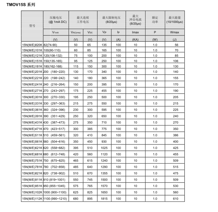 简述: TBMOV15S系列 •压敏电压从(200V-1800V) •符合RoHS,Reach标准,无铅 •专利的集成热保护装置 - •旨在促进符合UL1449第3版SPD产品 •高峰值浪涌电流额定值高达10kA •波可焊 •标准引线形式和间距选项 •低泄漏 •-55°C至+ 85°C的工作温度范围 产品通过UL,TUV,CQC认证