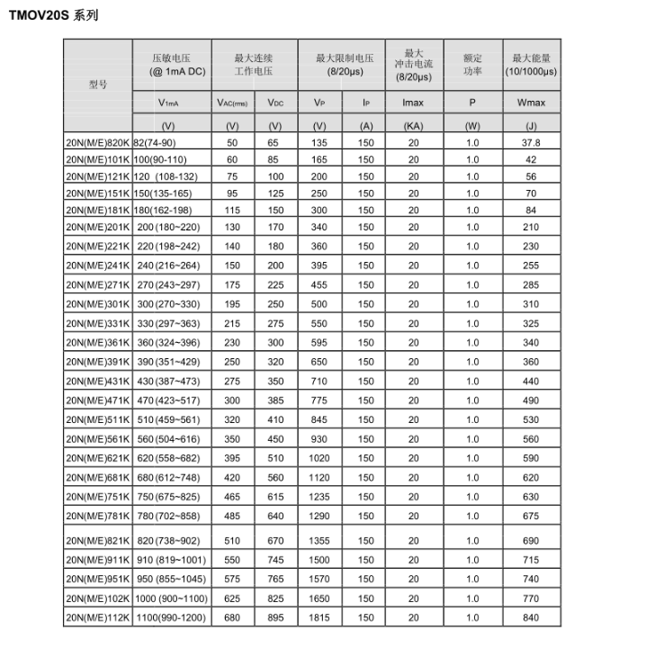 简述: TBMOV20S系列 •压敏电压从(18V-1800V) •符合RoHS,Reach标准,无铅 •专利的集成热保护装置 - •旨在促进符合UL1449第3版SPD产品 •和促进符合IEC62368 ,IEC61643-331产品 •高峰值浪涌电流额定值高达20kA •波可焊 •标准引线形式和间距选项 •低泄漏 •-55°C至+ 85°C的工作温度范围.产品通过UL,TUV,CQC认证