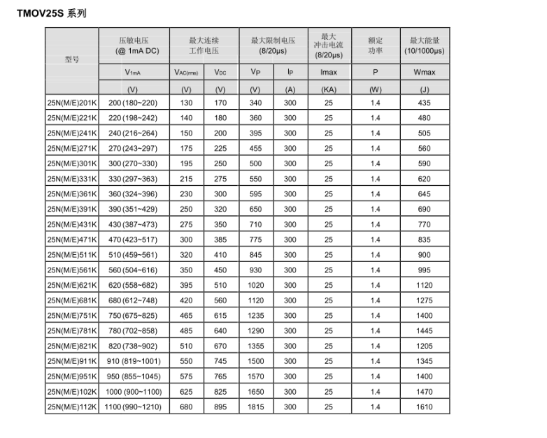 简述: TBMOV25S系列 •压敏电压从(18V-1800V) •符合RoHS,Reach标准,无铅 •专利的集成热保护装置 - •旨在促进符合UL1449第3版SPD产品 •和促进符合IEC62368 ,IEC61643-331产品 •高峰值浪涌电流额定值高达25kA •波可焊 •标准引线形式和间距选项 •低泄漏 •-55°C至+ 85°C的工作温度范围.产品通过UL,TUV,CQC认证