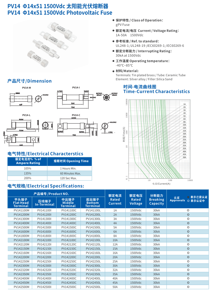 产品名称: 太阳能光伏熔断器 PV 14*51 1500VDC Photovoltaic Fuse