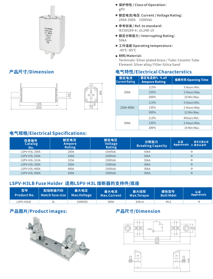 产品名称: 光伏熔断器 LSPV-H3XLl Photovoltaic Fuse
