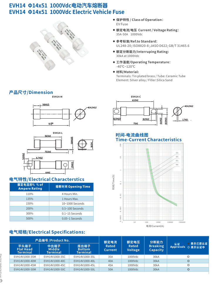 产品名称: 电动汽车熔断器EVH4 14*51 1000VDC Electric Vehicle Fuse