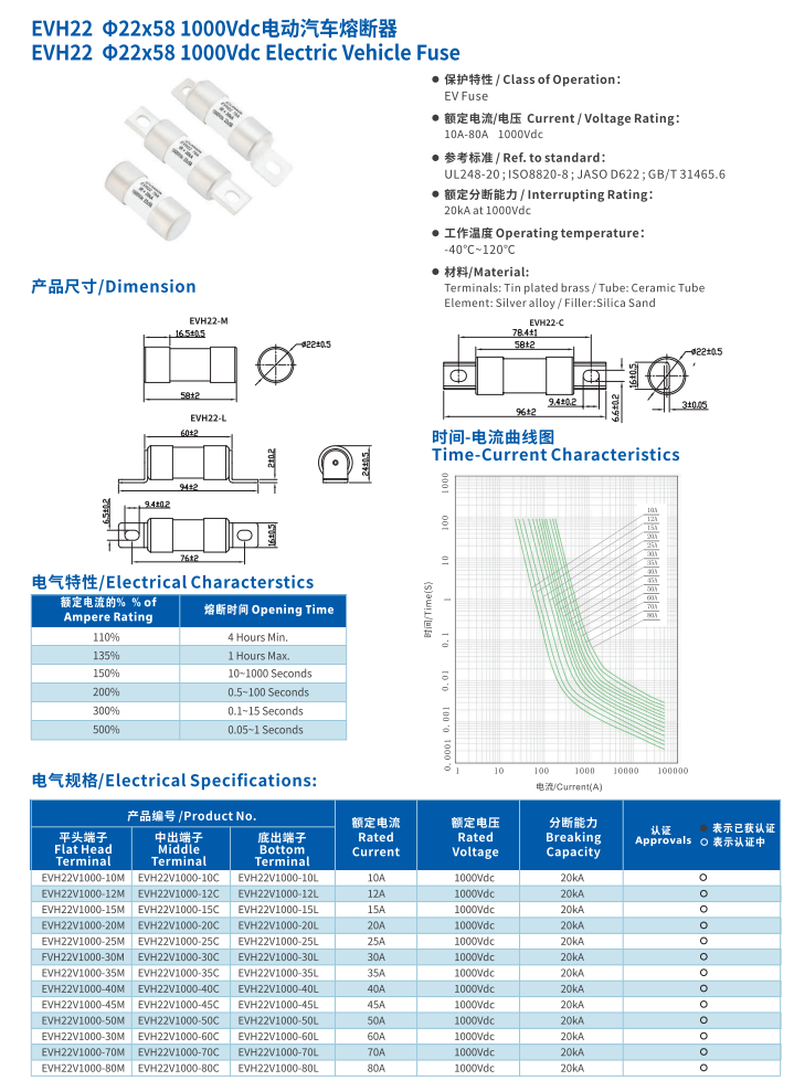 产品名称: 电动汽车熔断器EVH22 22*58 1000VDC Electric Vehicle Fuse