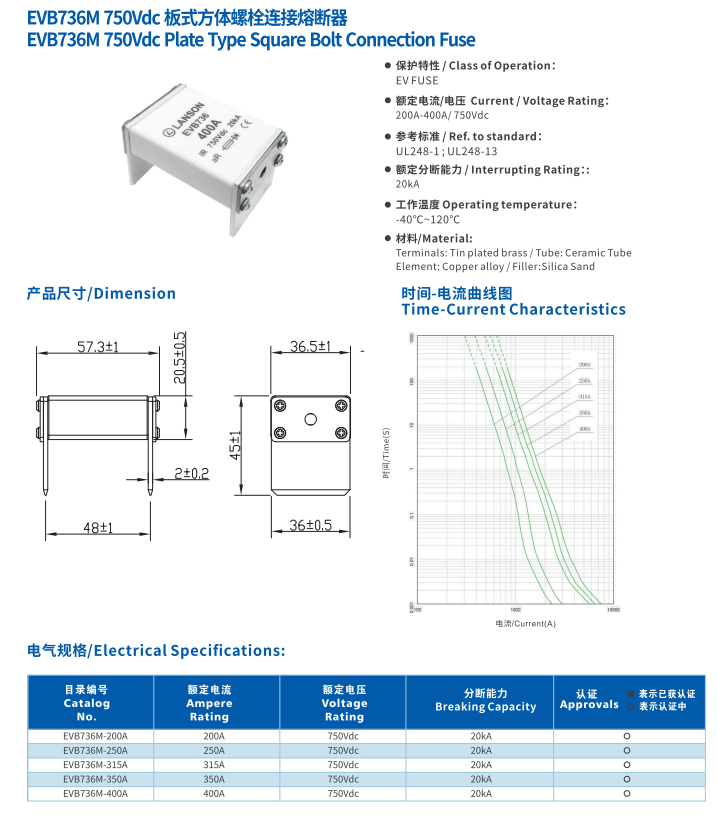 简述: 板式方体螺栓连接熔断器EVB736M 750V Type Spuare Boit Connertion Fuse