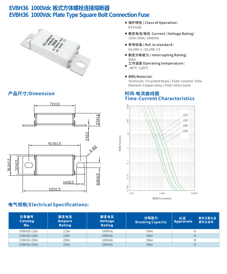 简述: 板式方体螺栓连接熔断器EVB36 1000V Type Spuare Boit Connertion Fuse