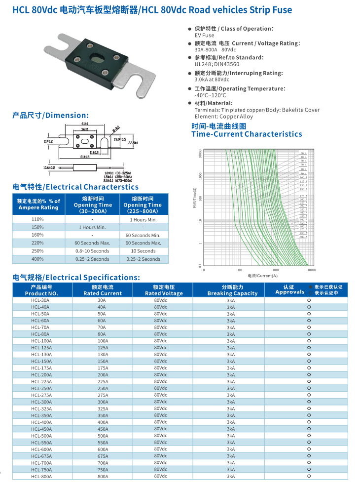 产品名称: 电动汽车板型熔断器HCL 80VDC Road vehiles Strip Fuse