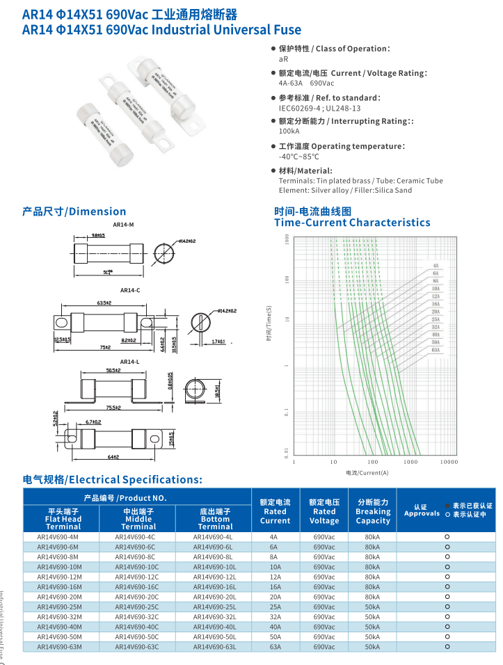 简述: 工业通用熔断器 AR14 14*51 690VAC INDUSTRIAL Universal Fuse
