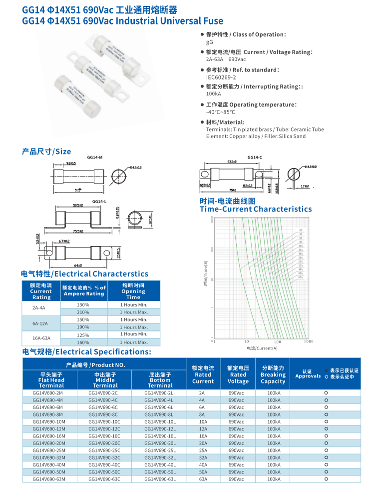 简述: 工业通用熔断器CG14 14*51 690VAC INDUSTRIAL Universal Fuse