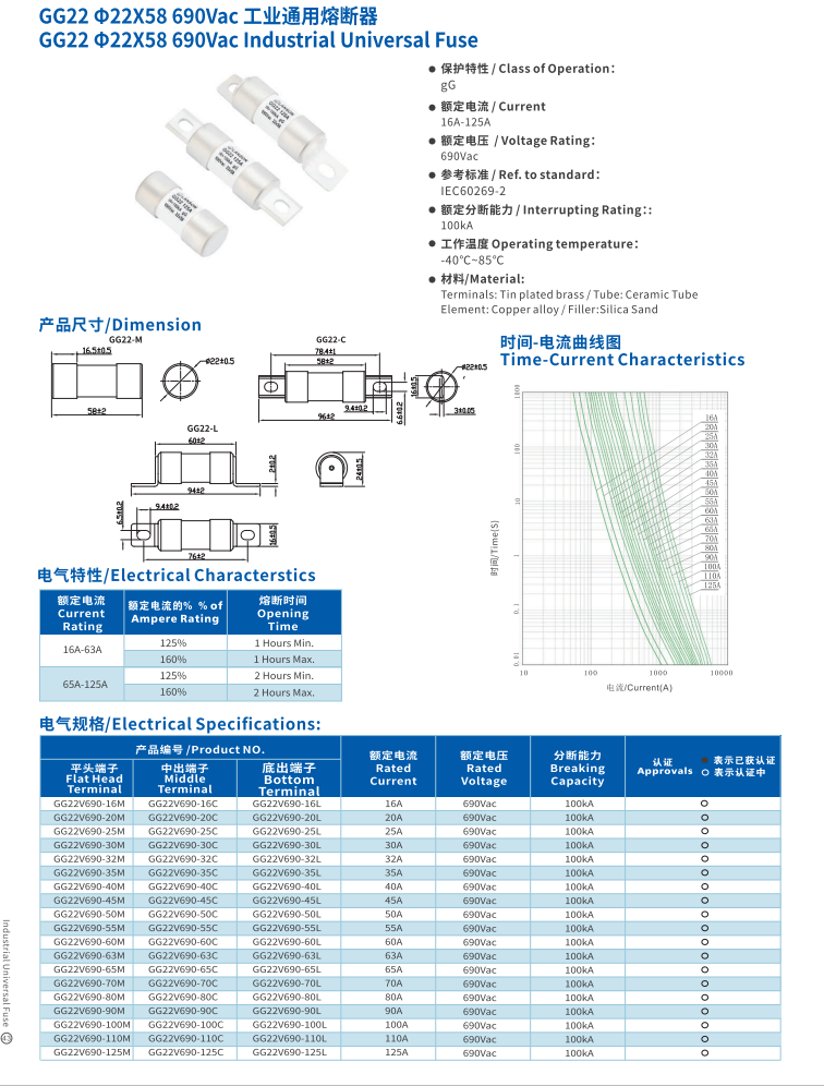 简述: 工业通用熔断器CG22 22*58 690VAC INDUSTRIAL Universal Fuse
